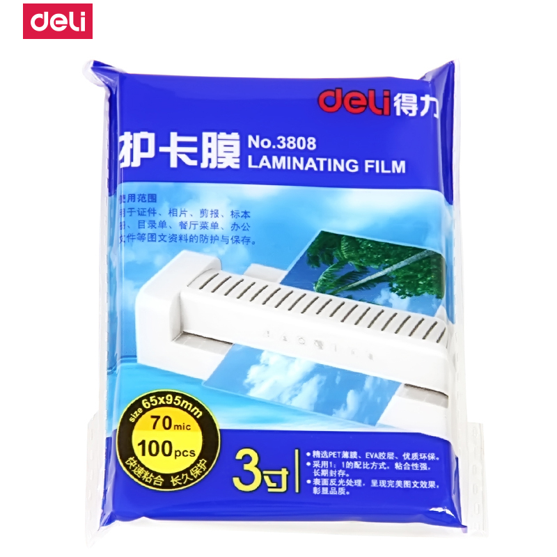得力 3808 塑封膜 3寸 70mic 透明白色 100张/包