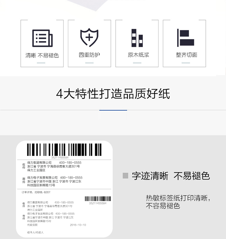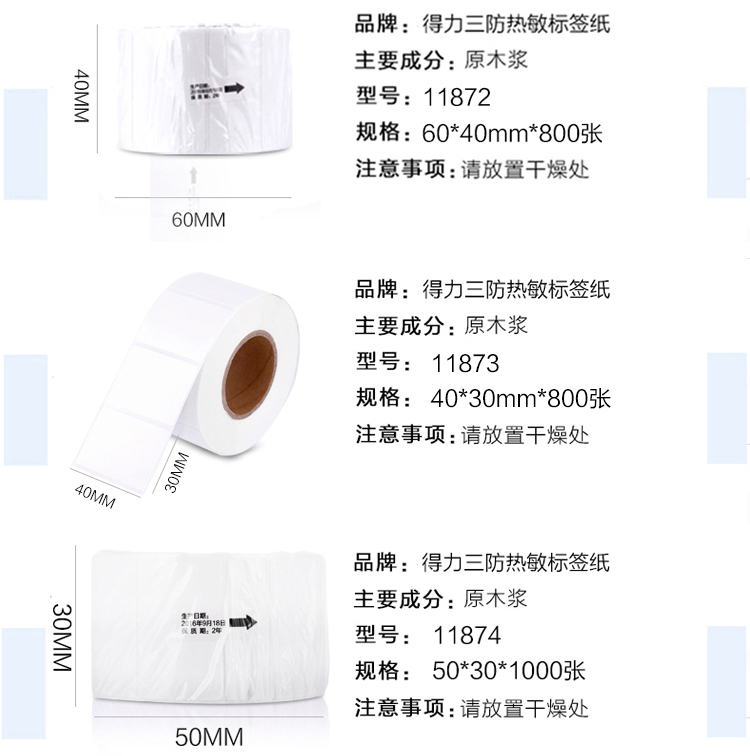 得力 11872 莱茵河长效三防热敏标签纸 60*40mm 白色 800张/卷