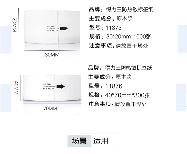 得力 11874 莱茵河长效三防热敏标签纸 50*30mm 白色 1000张/卷
